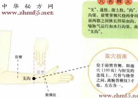 【支沟穴的位置】位于人体前臂背侧,当阳池与肘尖的连线上,腕背横纹上3寸,尺骨与桡骨之间。